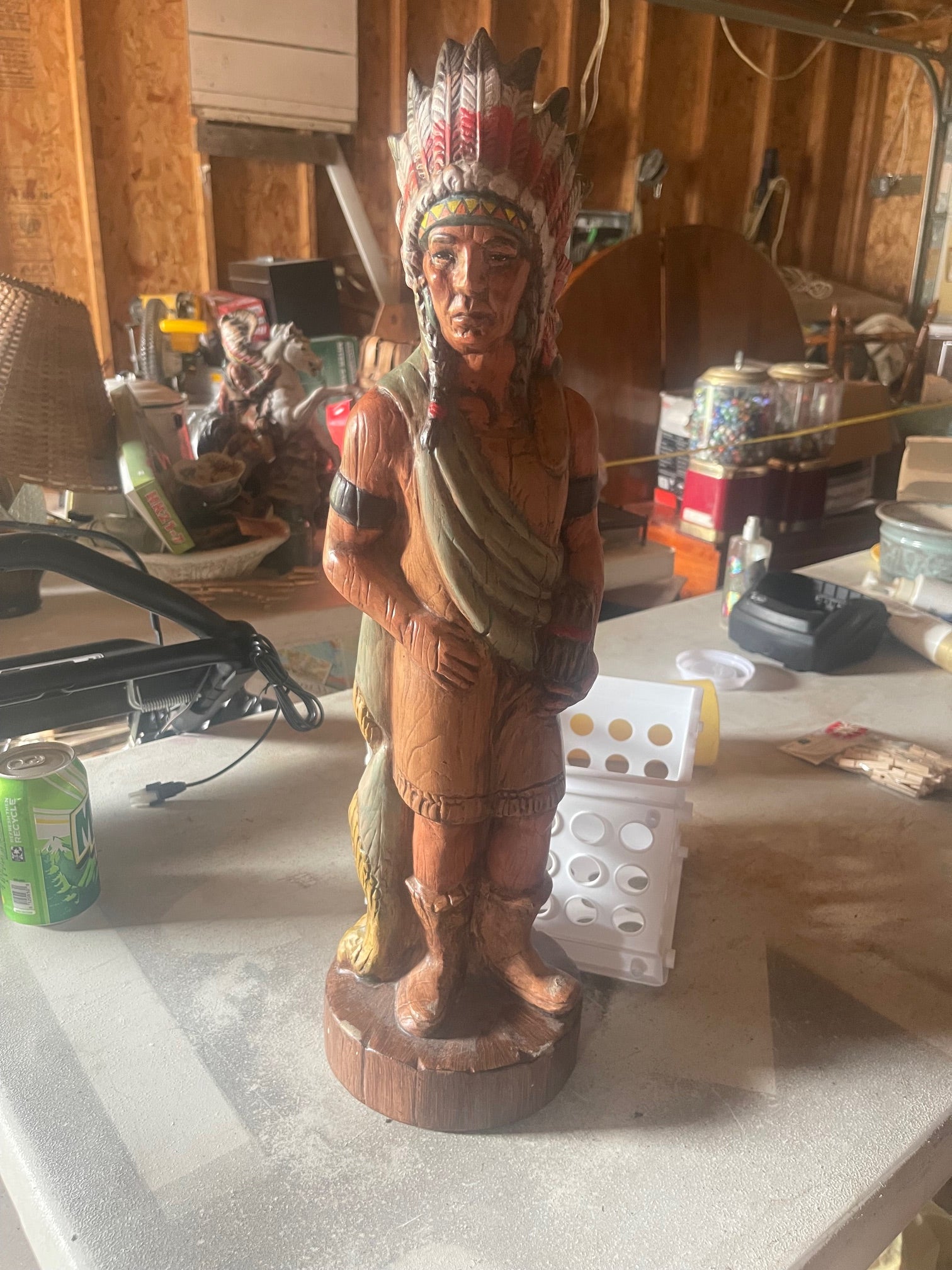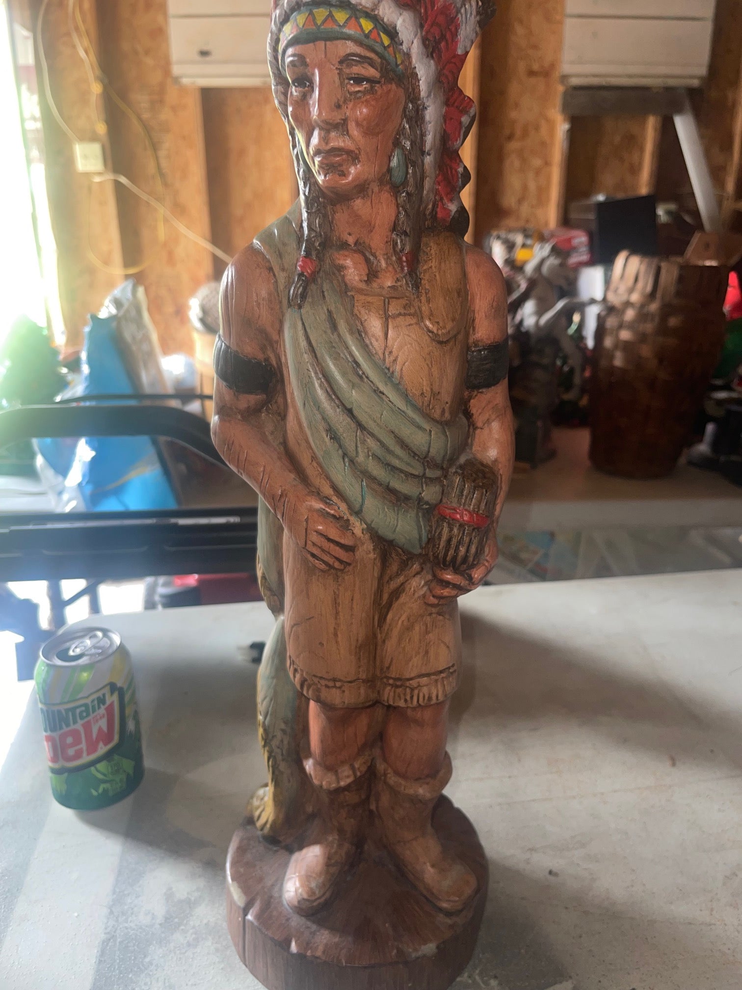 This 18-inch tall Native American statue captures intricate cultural details with expert craftsmanship. Its size makes it a striking yet manageable piece for display, embodying traditional artistry and symbolism. Perfect for collectors or those seeking to honor Native American heritage, this statue offers both aesthetic appeal and cultural significance.